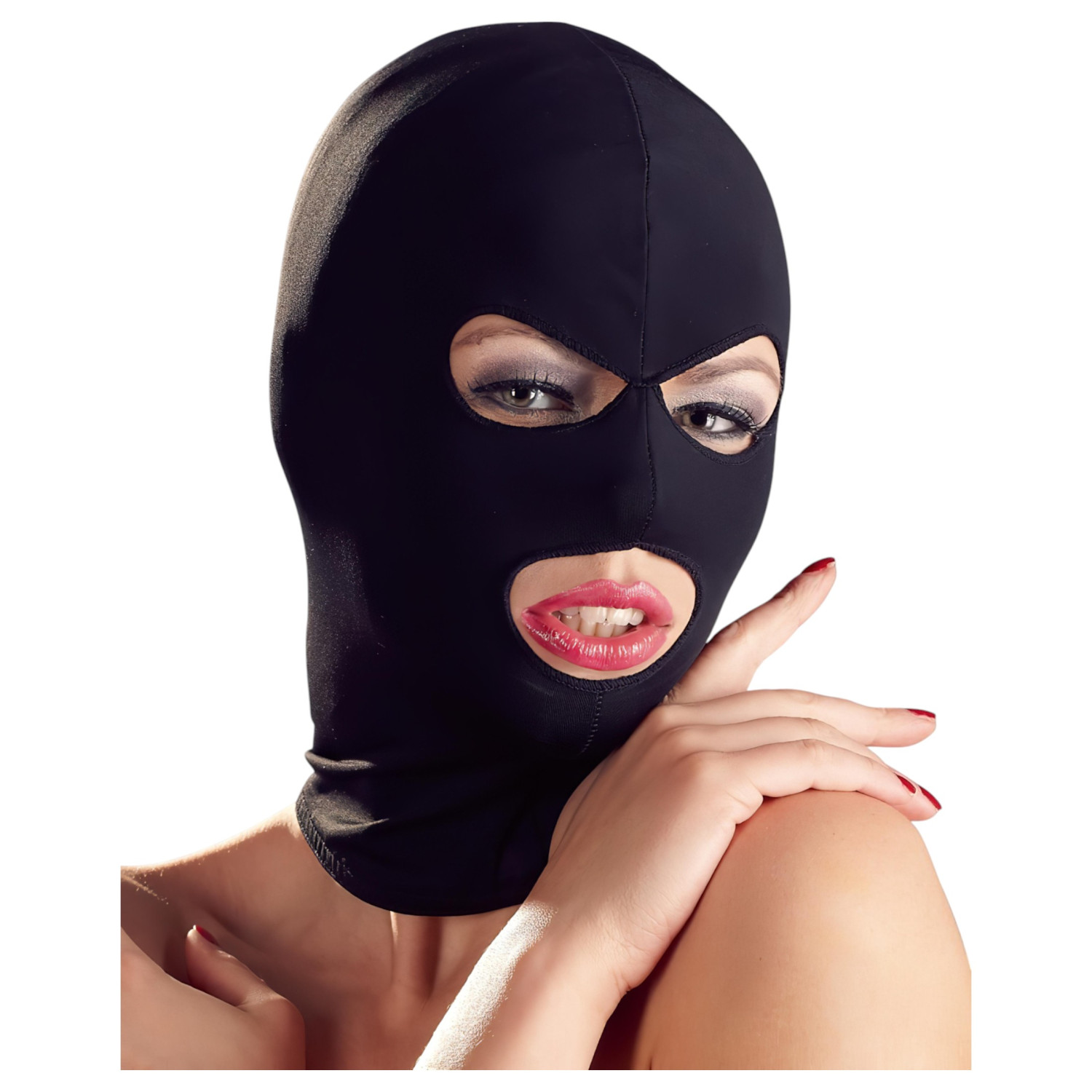 Diese schwarze, elastische Kopfmaske ist genau das Richtige für alle, die Lust haben, in die Welt von Rollenspielen und Dominanz einzutauchen.